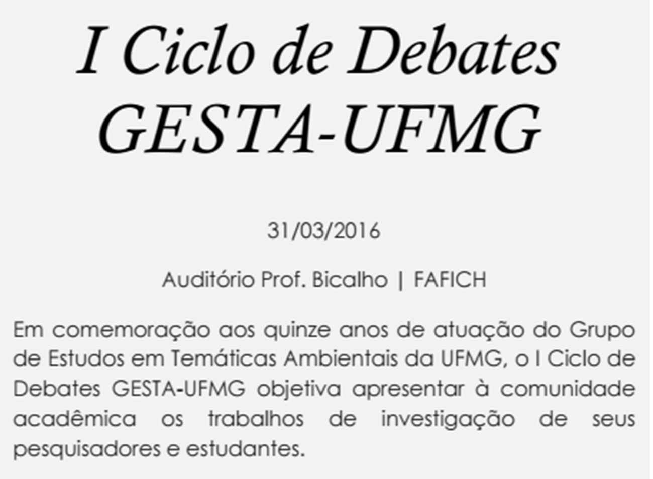 Esses seminários regulares terão com o I Ciclo de Debates GESTA-UFMG, que contará com três mesas redondas em um dia de programação .