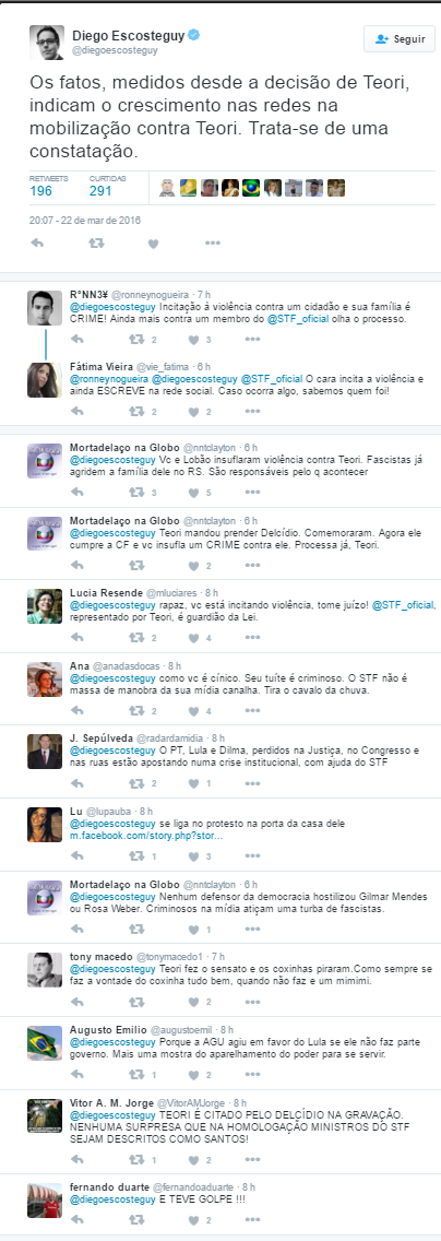 Mesmo com o boicote da mídia à divulgação do fato, é certo que haverá manifestações de desagravo a Teori, hoje, por parte dos demais ministros.
