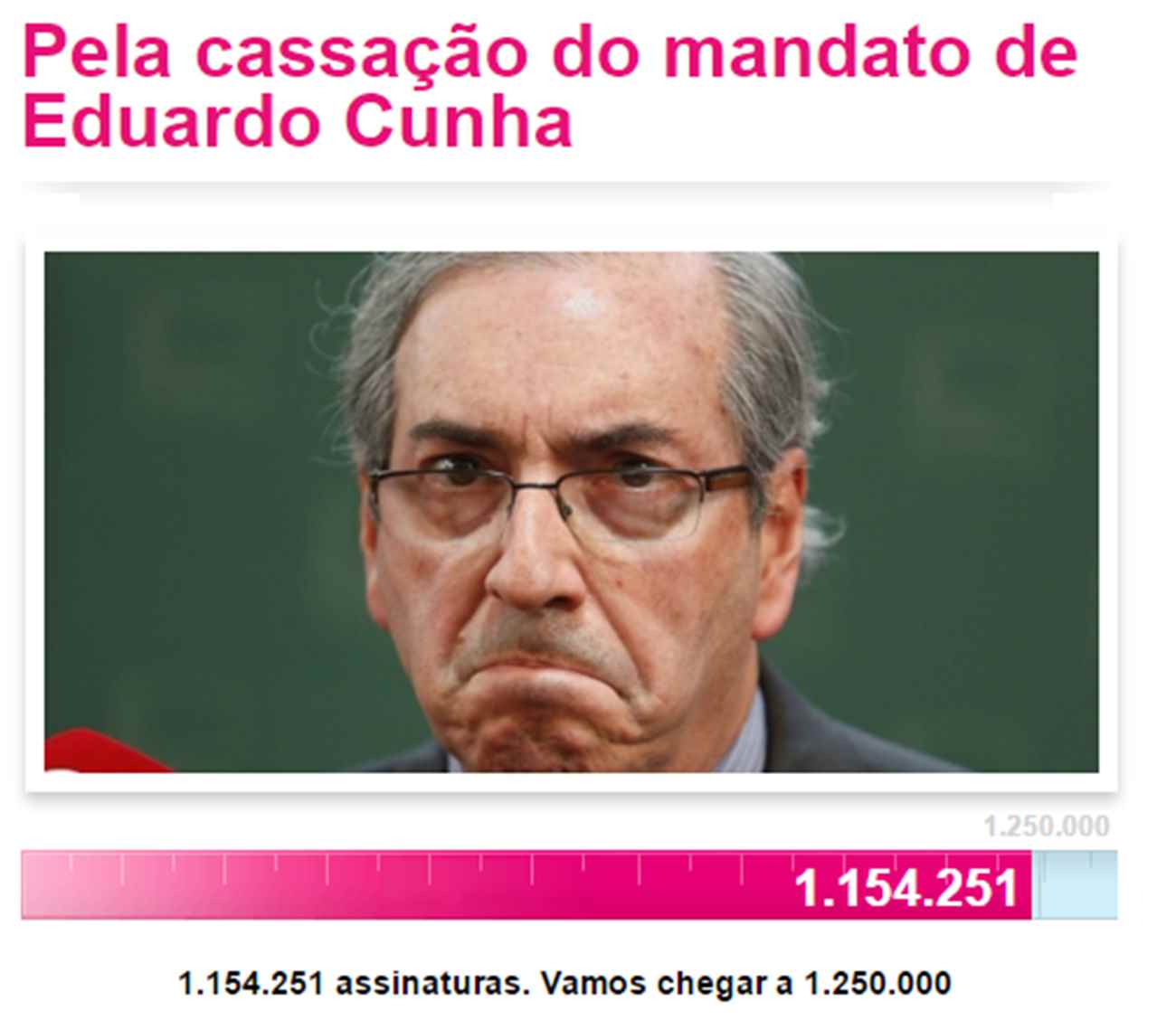 Abaixo-assinado na internet pedindo a cassação do mandato de Eduardo Cunha (PMDB-RJ), presidente da Câmara dos Deputados, ultrapassou a marca de 1 milhão na apoiadores na tarde desta terça (19). O objetivo é atingir 2 milhões e assinaturas para enviar o pedido ao Conselho de Ética contra a Câmara. O processo contra Cunha está perto de completar seis meses, sendo o mais longo da história da Câmara. A informação é publicada por Jornal GGN ao reproduzir a nota de Congresso em Foco.