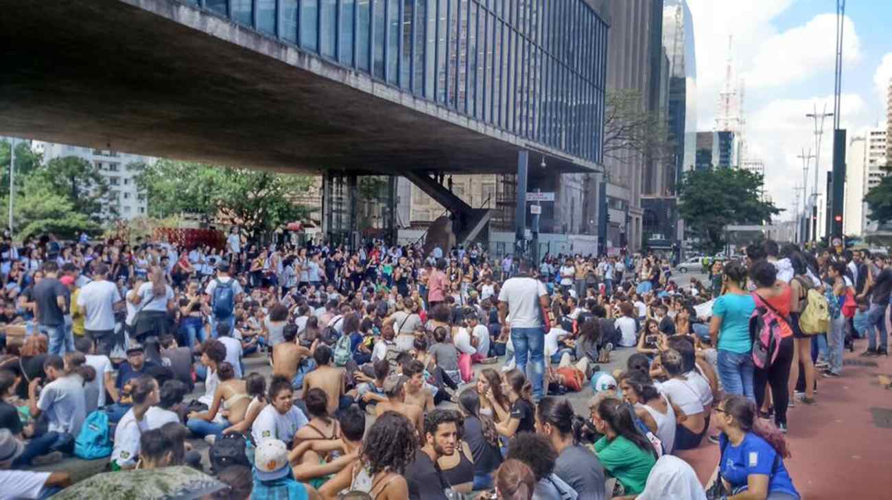 Foto: Estudantes do ensino médio de São Paulo ocupam o vão do MASP, em 21/4. Parte deles protestava contra o corte de verbas e também contra o risco de golpe parlamentar-midiático
