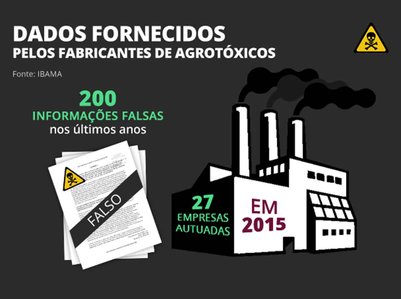 Mas as investigações dos impactos dos agrotóxicos na saúde têm enfrentado um grande obstáculo: as informações falsas. Nos últimos anos, o Ibama encontrou 200 dados falsos entre o que foi informado pelas empresas. Pela primeira vez, o resultado das auditorias foi reunido em um sistema digital e 27 empresas foram advertidas em 2015, o que acarreta no impedimento da comercialização de certos produtos.