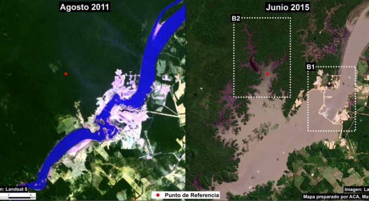Foto: Inundaciones inmediatamente aguas arriba de la represa Jirau entre 2011 (panel izquierda) y 2015 (panel derecha). Fuente: MAAP