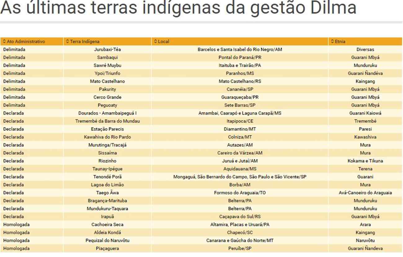 Do início do mês passado ao momento do afastamento de Dilma, o Executivo acelerou o processo de demarcação de terras indígenas: foram nove áreas delimitadas pela Funai, doze terras declaradas pelo Ministério da Justiça e quatro terras homologadas pela Presidência da República.