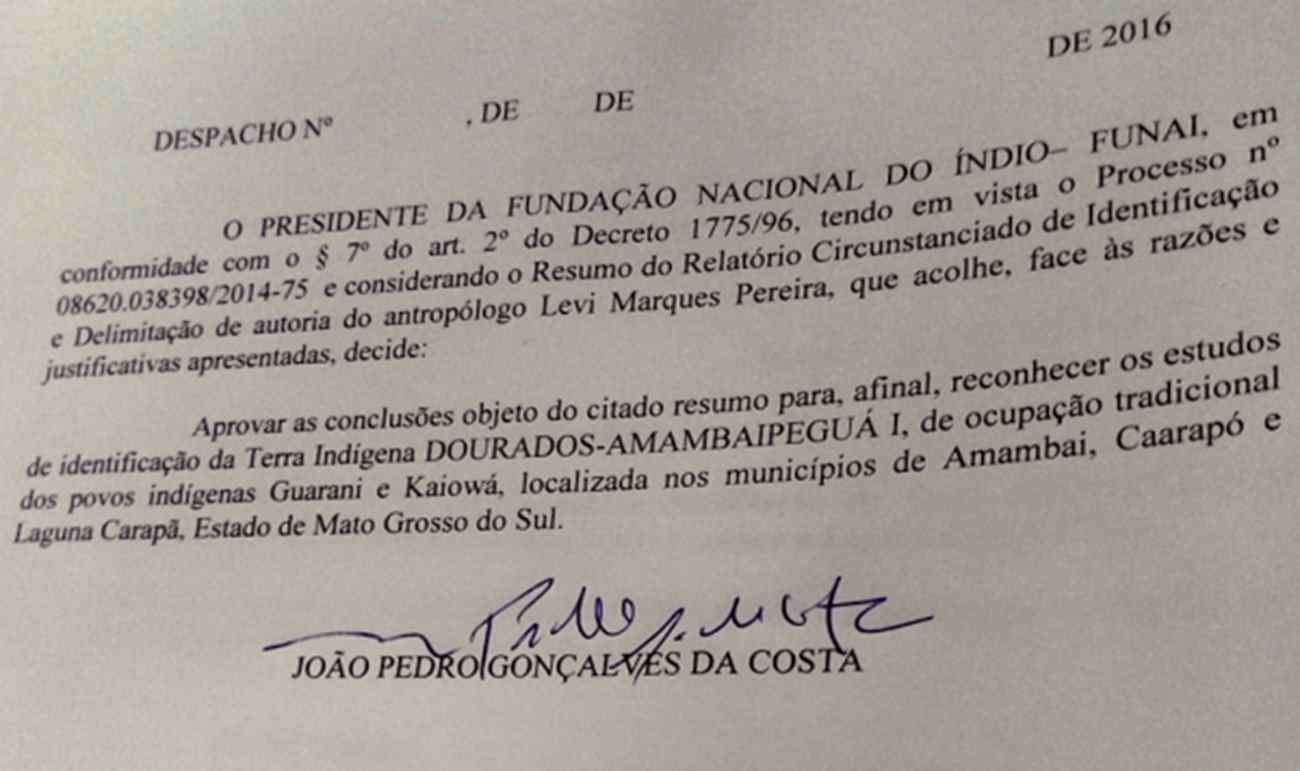 Na hora de assinar o relatório de identificação da área, Costa convocou as poucas lentes e gravadores que estavam na sede da Funai, um prédio espelhado no Setor Bancário Sul de Brasília, para presenciar o momento histórico. Naquela mesma manhã, Dilma Rousseff fazia seu primeiro discurso no Palácio do Planalto como presidente afastada após a abertura do processo de impeachment pelo Senado.