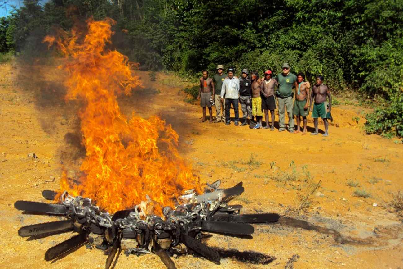 Indígenas e fiscais do Ibama queimam motosserras apreendidas na operação Kayapó, em 2014, que deu origem à operação Rios Voadores (foto: Ibama)