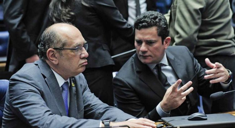 O ministro do Supremo Tribunal Federal Gilmar Mendes e o juiz federal Sérgio Moro conversam no plenário do Senado Federal durante sessão de debates temáticos destinada a discutir projeto de lei que define crimes de abuso de autoridade (Foto: Geraldo Magela/Agência Senado)