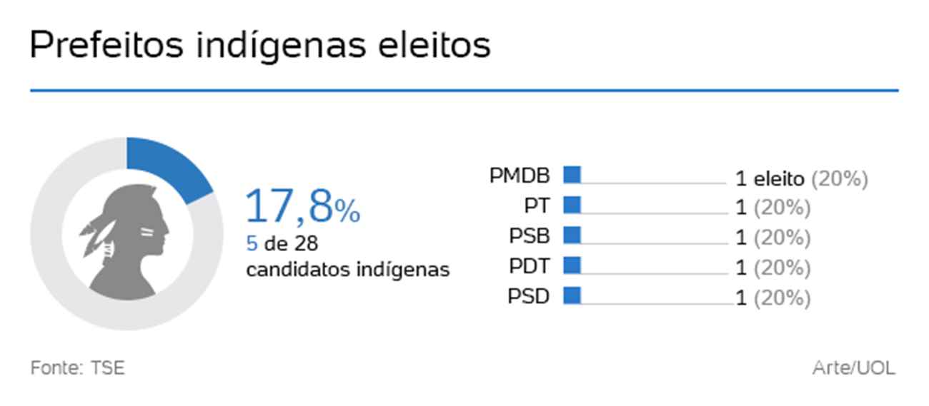 Proporcionalmente, o número de prefeitos e vereadores indígenas eleitos no último pleito é ainda menor: 0,08% entre os prefeitos e 0,28% entre os vereadores.