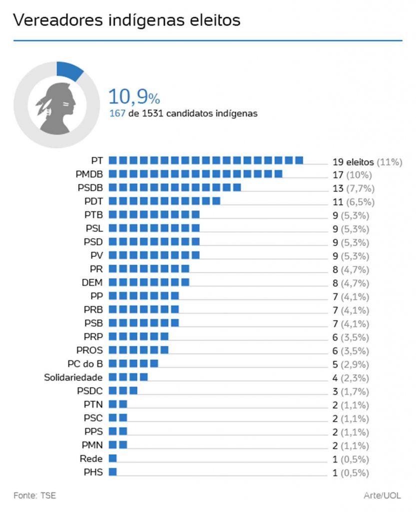 Os indígenas também conseguiram emplacar vereadores em 107 municípios brasileiros. Dois deles, São Gabriel da Cachoeira (AM) e Marcação (PB), além de contarem com prefeitos indígenas eleitos, também terão expressivas bancadas de povos autóctones a legislar a partir do ano que vem. Entre os partidos com mais representantes eleitos estão o PT (19 vereadores), o PMDB (17) e o PSDB (13).