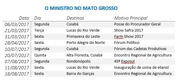 No caso do Mato Grosso, o ministro prestigiou muitos eventos regionais. No dia 18, por exemplo, esteve no Encontro Regional de Agricultura de Barra do Garças. Um mês antes, em evento similar em Alta Floresta. Em uma dessas viagens ele esteve acompanhado do presidente Michel Temer, pela primeira vez no Mato Grosso desde que assumiu a Presidência. Eles foram inaugurar uma usina de etanol que pertence a um aliado do presidente dos Estados Unidos, Donald Trump: “Temer inaugura, no MT, usina de etanol que pertence a conselheiro de Trump“.