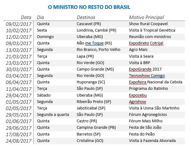 O levantamento foi feito pelo De Olho nos Ruralistas. A agenda oficial do ministro só disponibiliza os dados dos últimos seis meses. Não foram consideradas viagens que não estivessem na agenda oficial. No sábado ele esteve em Esteio (RS), na abertura da 40ª Expointer, mas a viagem ainda não consta da agenda divulgada pelo Ministério da Agricultura, Pecuária e Abastecimento.