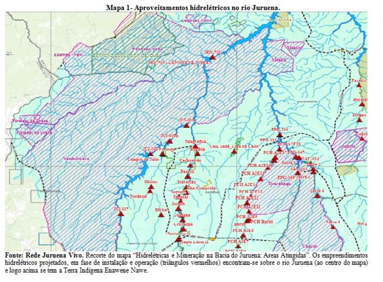 Um exemplo do que acima foi afirmado são os aproveitamentos hidrelétricos na Bacia do rio Juruena no Mato Grosso (Mapa 1), os quais modificaram a dinâmica dos rios e, por consequência, a ictiofauna (peixes) regional, impactando, irreversivelmente, os modos de vida tradicionais dos Enawene Nawe, os quais têm no peixe base de seus rituais e da sua dieta alimentar.