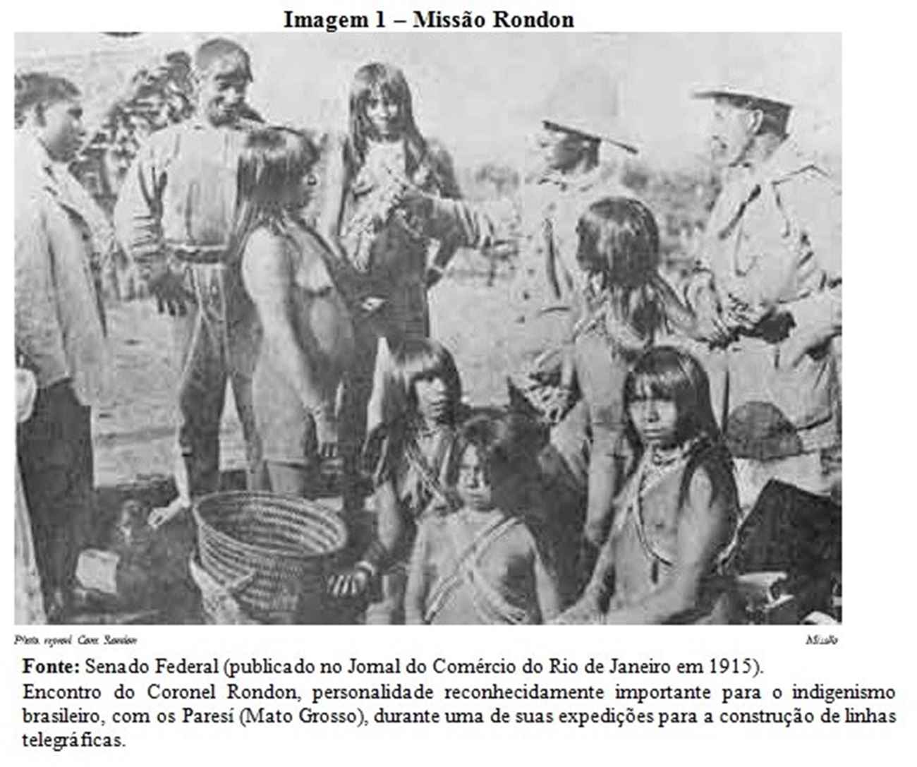 Vale ressaltar que a convivência dos povos indígenas com empreendimentos também não é recente. Aqui exemplificamos o contato (Imagem 1) das Comissões de Construções das Linhas Telegráficas do fim século 19 e início do século 20, empreendimentos que visavam interligar o território nacional e garantir a proteção das fronteiras, como as de Cuiabá ao Araguaia (1890-1891), Mato Grosso (1900-1906) e Mato Grosso ao Amazonas (1907-1915).