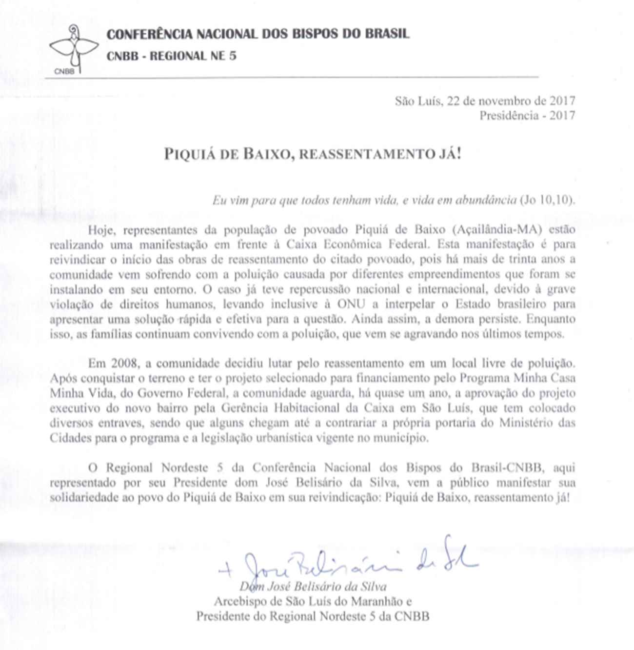 Leia também a nota de solidariedade do Arcebispo de São Luís, dom José Belisário, para com a comunidade de Piquiá de Baixo e sua manifestação em frente à Caixa:
