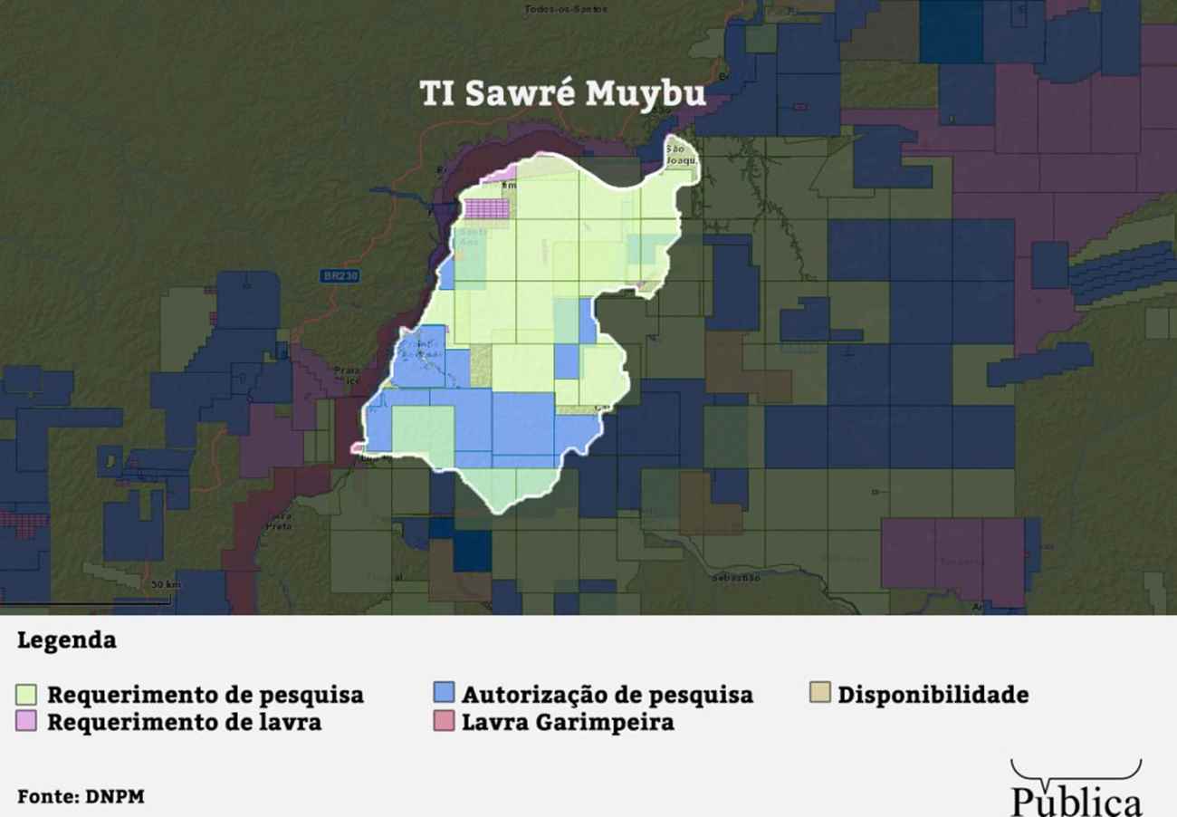 Apesar de a mineração em terra indígena não ser regulamentada, a Agência Nacional de Mineração permite o registro de pedidos de pesquisa e lavra nessas áreas. É outro aspecto da especulação, que se baseia na expectativa de que essa regulamentação aconteça. O tema caminha há duas décadas no Congresso, em diferentes projetos de lei, e voltou à discussão recentemente. Toda a Sawré Muybu é coberta por dezenas de processos minerários de diferentes tipos, como se vê na imagem abaixo.