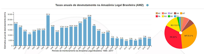 Os valores ainda se encontram em patamares na casa dos milhares de km2 anuais, sendo que, para o ano de 2017, foram 6.947 km2 para a Amazônia Legal e 7.408 km2 para o bioma Cerrado.