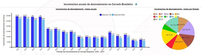 “Há uma queda dos valores anuais do desmatamento, com relação a 2010. Contudo, é importante ressaltar que o valor encontrado para a Amazônia ainda é quase o dobro da meta estabelecida para ser alcançada até 2020, que é de 3.587 km2”, avalia. Em relação ao bioma Cerrado, “ainda que os valores de 2016 e 2017, respectivamente 6.777 km2 e 7.408 km2, estejam abaixo da meta estabelecida pelo governo brasileiro, que é de 9.420 km2, ainda são valores bastantes significativos, o que aponta para uma necessidade de continuar o combate ao desmatamento”. As causas do desmatamento nos dois biomas estão relacionadas principalmente à expansão da fronteira agrícola brasileira.