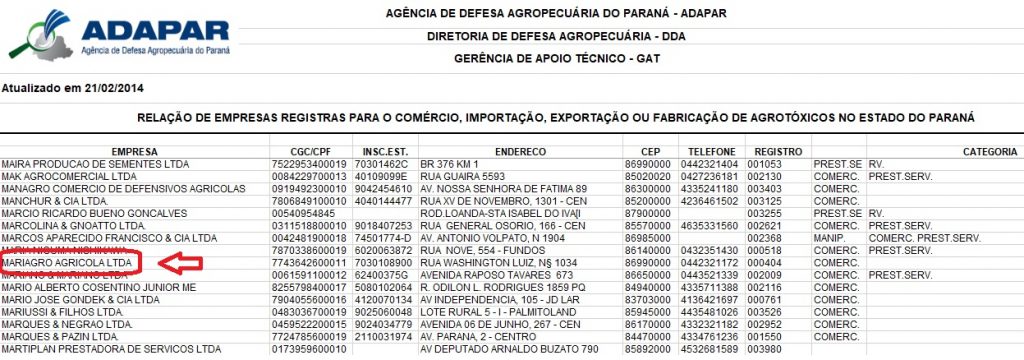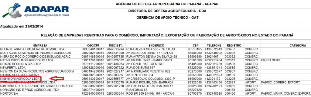 Confira o registro da Nishimori Agrícola, como empresa comercializadora de agrotóxicos, em lista divulgada em 2014 pela Agência de Defesa Agropecuária do Paraná (Adapar):