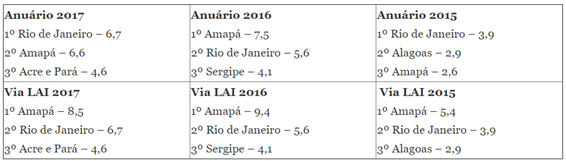 Atualizadas, as posições dos últimos três anos se modificam. De terceiro colocado em 2015, o Amapá se torna o primeiro; em 2016, mantém o primeiro lugar mas com índice maior; em 2017, de segundo passa ao primeiro lugar.