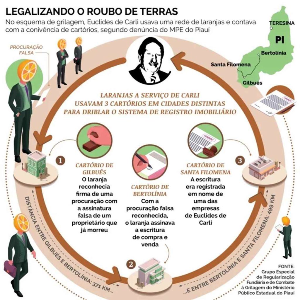 Ele responde, contudo, por uma ação na Justiça, que o acusa de grilagem e que bloqueou, por meio de liminar, 124 mil hectares de uma de suas fazendas no Sul do Piauí. Uma das estratégias usadas por Carli para conseguir as propriedades na região de Matopiba – acrônimo formado pelas siglas do Maranhão, Tocantins, Piauí e Bahia – envolve o uso de laranjas e um esquema de triangulação com três cartórios, de acordo com a ação judicial. Ainda segundo a ação, os cartórios são suspeitos de terem sido coniventes com o esquema pois chegaram a aceitar procuração assinada por pessoas mortas.