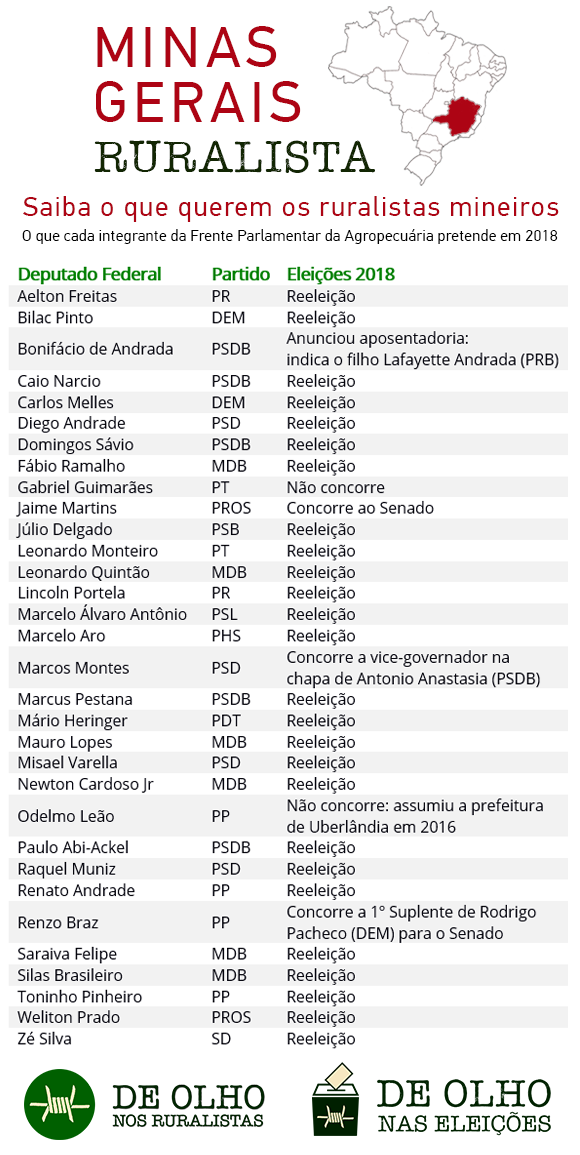A maior bancada ruralista do Congresso – em números absolutos – pretende reeleger 26 parlamentares signatários da Frente Parlamentar da Agropecuária (FPA). É exatamente com a bancada mineira que o De Olho nos Ruralistas – no mês em que seu site completa dois anos – inaugura sua cobertura eleitoral. O observatório detalhará, nos próximos 20 dias, quem são os candidatos ruralistas à reeleição, com pelo menos um texto por Unidade da Federação.