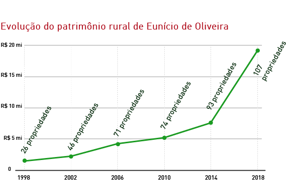 O presidente do Senado, Eunício de Oliveira (MDB), é o principal representante da bancada ruralista no Ceará. Em 1998, ele registrou 6.948 hectares em 24 fazendas no Tribunal Superior Eleitoral (TSE). Este ano, candidato à reeleição, soma pelo menos 14.473 hectares, divididos em 107 propriedades.