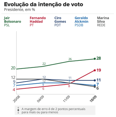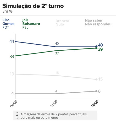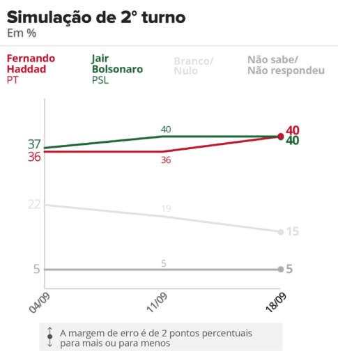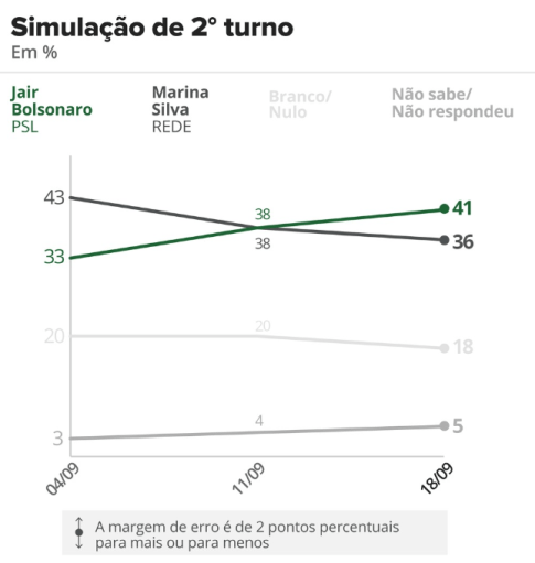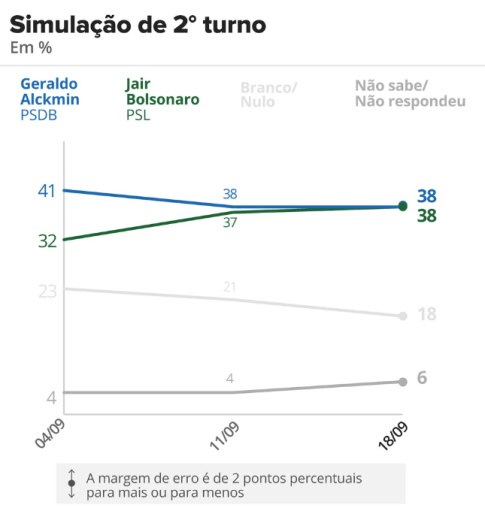 Contudo, o Ibope mostra também dois outros fatos imensamente relevantes, que talvez o entusiasmo ofusque. Primeiro: uma impressionante ampliação das chances de Bolsonaro no segundo turno. Há duas semanas (pesquisa de 4/9), o candidato fascista era praticamente um pária: surrado na disputa final por Ciro Gomes (44% x 33%), Marina (43% x 33%), Alckmin (41% x 32%), acima apenas de Fernando Haddad (36% x 37%). Em pouco tempo, as previsões se reverteram. Agora, Bolsonaro vence com folgas Marina (41% x 36%), empata com Alckmin (38% x 38%) e Haddad (40% x 40%) e perde apenas para Ciro, porém na margem de erro (40% x 41%).