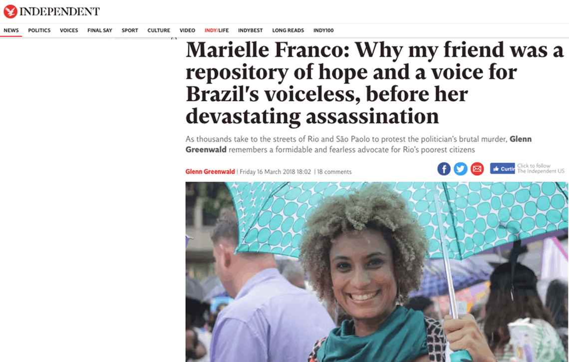 Eu então passei a ver isso como uma forma de processar minhas emoções sobre a Marielle, fazendo o que eu melhor sei fazer: escrever sobre batalhas e causas políticas, e sobre figuras dissidentes que desafiam o status quo. Exatamente o que Marielle sempre representou. Com isso em mente, me dediquei a transmitir para um público estrangeiro o que tornava e ainda torna Marielle uma força inspiradora tão singular. Acabei escrevendo um artigo de 1.000 palavras, meio obituário, meio reflexão pessoal.