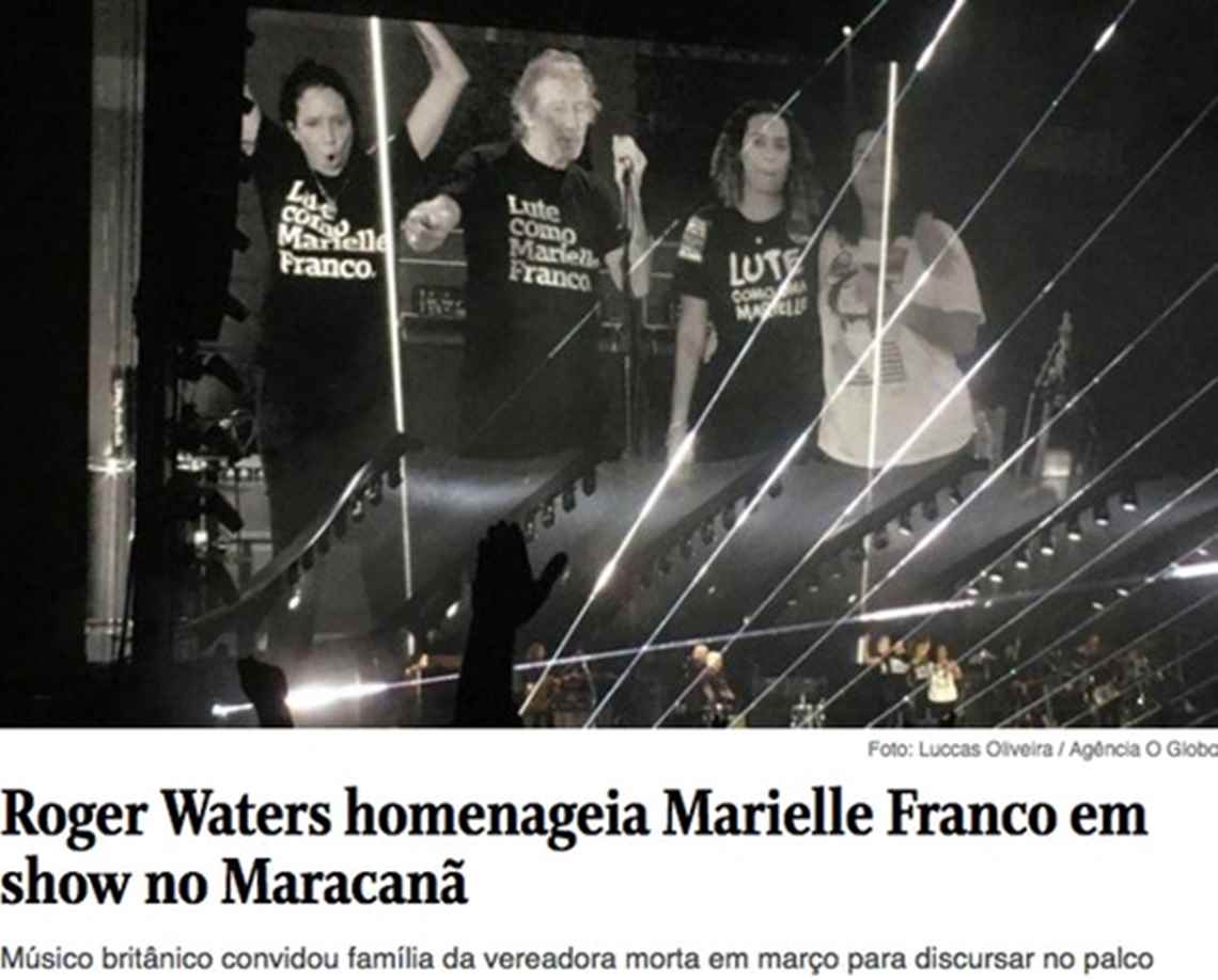O principal jornal do país estampou esse momento na primeira página – a homenagem prestada por Roger Waters à Marielle – o que é uma boa lembrança de que, mesmo nos momentos mais difíceis, pode ser possível encontrar luz e inspiração.