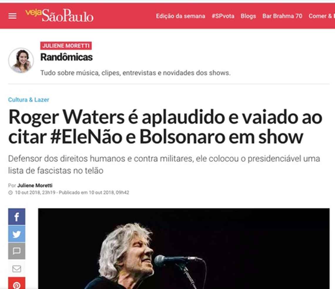 Roger Waters está há três semanas em turnê pelo Brasil, fazendo shows para estádios lotados e usando sua plataforma para fazer manifestações políticas numa hora e num lugar em que isso é mais necessário do que nunca. Em seu primeiro show no país, suas críticas contundentes à ascensão do fascismo na forma de Jair Bolsonaro geraram vaias e o cancelamento de reservas. Desde então, ele só aumentou sua cruzada política, fazendo não a caricatura barata e superficial das declarações políticas de celebridades, mas uma campanha com uma mensagem profunda, bem informada e sofisticada, que funde arte às causas humanitárias (o que não surpreende partindo de alguém que vem arriscando – e perdendo – tanto por sua defesa duradoura e implacável da causa palestina).