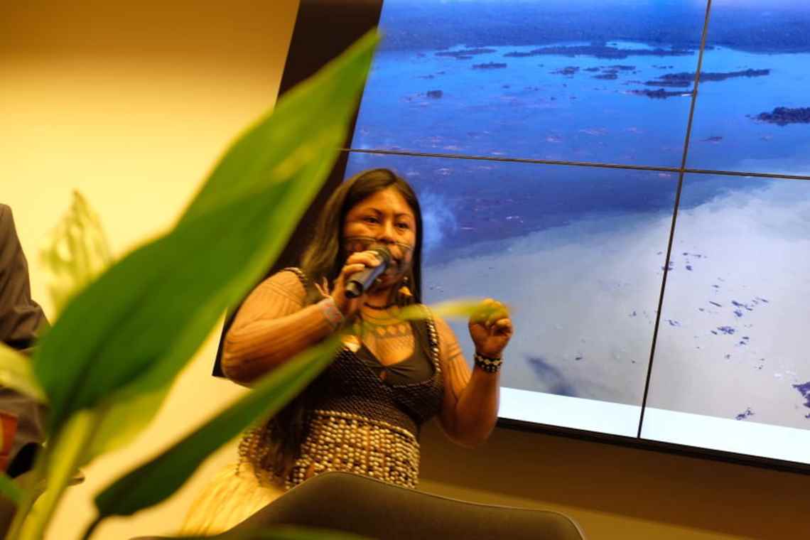 “Querem arrancar nossas raízes, mas as nossas raízes são fortes, nossas raízes estão lá dentro, no fundo. Cada vez que tiram nossas raízes, a semente ela brota, ela cai, e cada vez nasce mais”, continua. “Vocês precisam deixar a Amazônia em paz. Sawe!”, terminou Alessandra Munduruku, arrancado aplausos da plateia e da mesa.