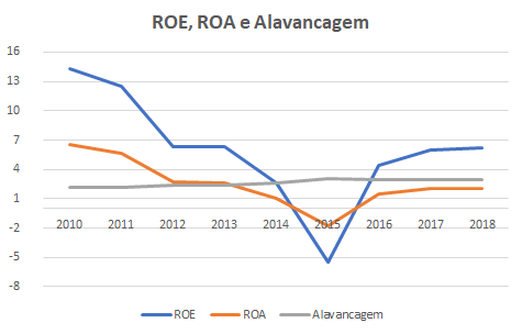 A mesma figura apresenta também o indicador ROA (return on assets) que é dado pela razão entre o resultado líquido e o ativo total da empresa (que corresponde ao investimento total feito na empresa). Tendo-se o ROE e o ROA pode-se calcular o grau de alavancagem, isto é, um número que vem da razão entre o ativo total da empresa e o patrimônio líquido (ou capital próprio). É importante notar que a alavancagem cresce no período, passando de um valor em torno de 2 para um valor em torno de 3. Esse indicador mostra que as empresas da amostra tiveram de passar a depender mais do capital de terceiros em virtude da depressão. Ora, dado o altíssimo custo do capital de terceiros no ambiente econômico do Brasil, a elevação da alavancagem é um sinal forte de que a situação financeira das empresas piorou muito no período.
