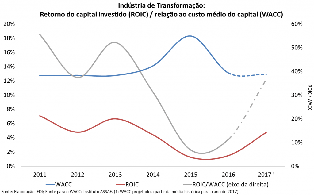 Para completar o quadro, a figura8 abaixo apresenta alguns indicadores de lucratividade calculado também pelo IEDI, agora apenas para a indústria de transformação. Note-se, em primeiro lugar, que ela apresenta uma medida de rentabilidade denominada ROIC (Return Over Invested Capital). Esta é construída como uma razão entre o lucro operacional líquido após o pagamento de impostos e o capital total da empresa, o qual é formado pela soma do capital próprio e do capital de terceiros. O gráfico dessa variável (em vermelho) mostra uma queda da taxa de lucro entre 2010 e 2016, indicando também que ela passa, tal como mostrou também o gráfico anterior, a se recuperar daí então – ainda que de modo insuficiente.
