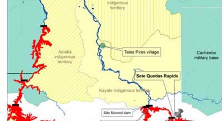 O mapa mostra as barragens e reservatórios no Rio Teles Pires e as Terras Indígenas da região. Karobixexe (Sete Quedas), era um local sagrado extremamente importante para o povo Munduruku e foi dinamitado durante a construção da barragem de Teles Pires. Mapa: Maurício Torres.