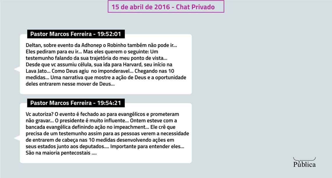 Não é de hoje, contudo, que Dallagnol recorre às igrejas evangélicas para se promover ou defender a Operação Lava Jato. Ele também fez uma campanha massiva nas igrejas em 2015 e 2016 para colher as assinaturas para as dez medidas de combate à corrupção. Nesse período, rodou pelo menos 24 igrejas evangélicas. “Você está inaugurando um novo momento do protagonismo cristão”, avaliou o pastor Marcos Ferreira, membro do Instituto Mude, em conversa com Dallagnol em 18 de julho de 2016 pelo Telegram.