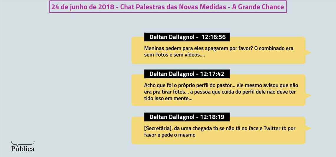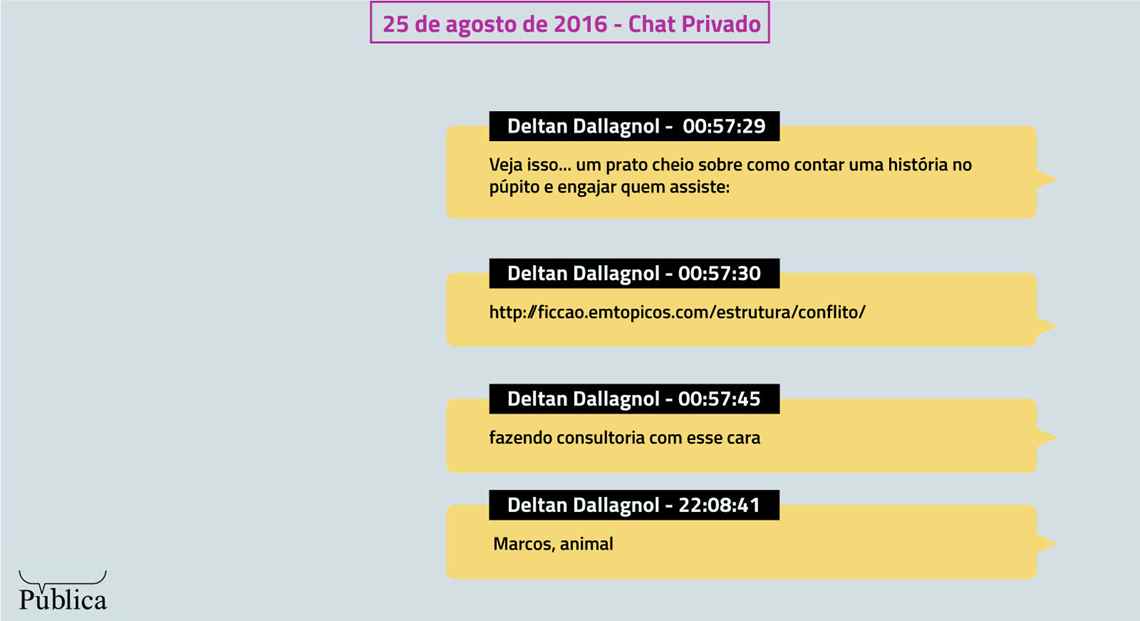 Participavam deste chat duas funcionárias do MPF e Patrícia Fehrmann, membro do Instituto Mude – Chega de Corrupção. Elas eram responsáveis por administrar a agenda da campanha promovida por Deltan Dallagnol e trabalhavam para manter os dias do chefe da força-tarefa sempre cheios de encontros e palestras. Às vezes ele era convidado, às vezes elas produziam o evento. “Tudo temos que ver tamanho de público e avaliar conveniência comparando com outros convites pro mesmo local e marcando eventos e reuniões”, explicou o procurador a elas.