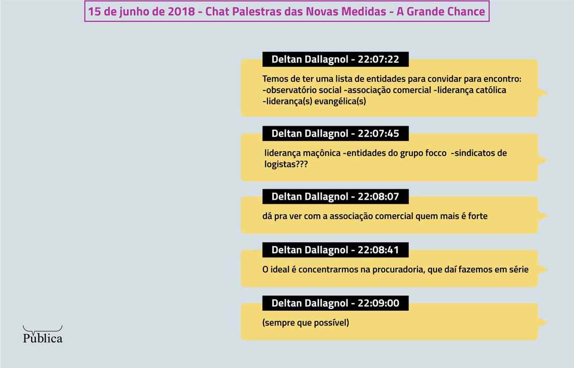 As mensagens do chat “Palestras das Novas Medidas – a Grande Chance” mostram que ele misturou suas intenções políticas e sua militância com sua função como servidor público: “[Secretária], tenta uma agenda com Paulo Zanardi, Diretor do Rotary Internacional, para mim? Ele mora em Curitiba. Pergunta se ele aceitaria um convite para conhecer a FT e falarmos do momento atual do esforço brasileiro contra a corrupção”, afirmou em conversa no Telegram em três de junho de 2018. “Meninas, precisamos fazer um followup das reuniões passadas. [Secretária], pega o contato de todos aqueles com que já me reuni nos diferentes locais e vamos fazer um email indicando que o lançamento das novas medidas e da campanha, pela TI, será nesta terça. Pega todos os contatos e amanhã entrego um texto de email pra enviarmos”, acrescentou.