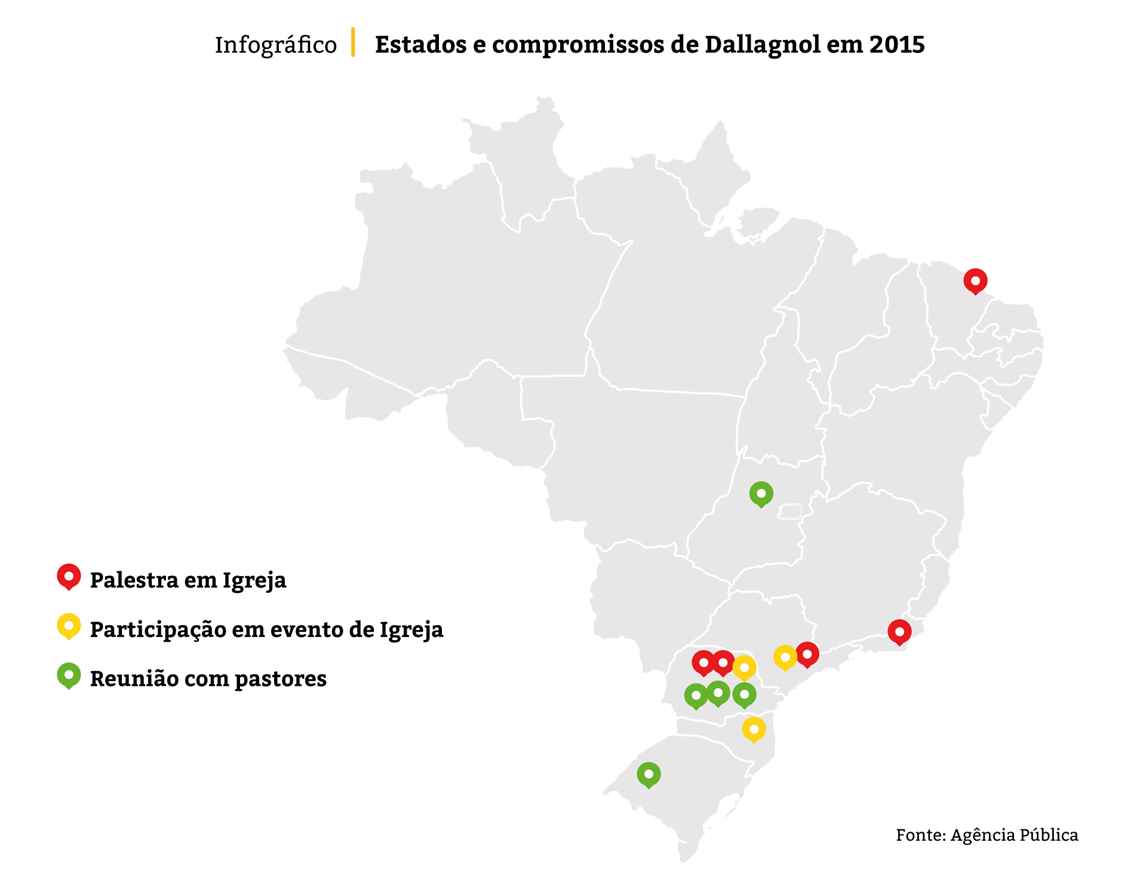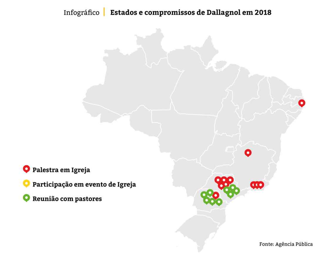 As agendas foram retiradas das conversas do procurador Deltan Dallagnol no Telegram com o pastor Marcos Ferreira e no chat Palestras das Novas Medidas – A Grande Chance. É possível que algum evento tenha sido cancelado e o assunto não tenha sido tratado nas conversas. Para fazer esse levantamento, a reportagem também buscou informações nos sites e mídias sociais das igrejas.