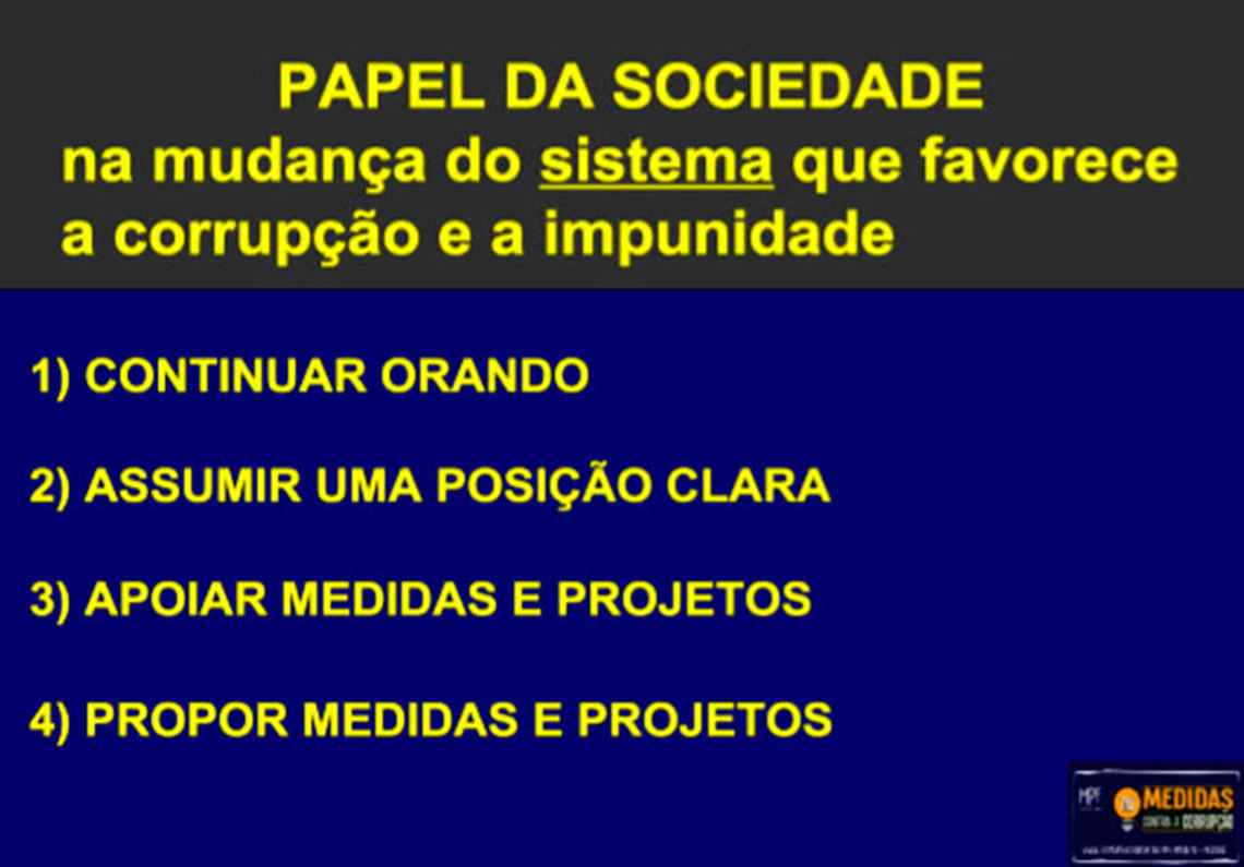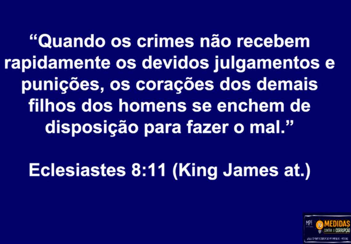 O chefe da força-tarefa da Lava Jato ainda usou no seu PowerPoint – com a logomarca oficial da campanha do MPF –, passagens bíblicas para falar, por exemplo, sobre punição de crimes: “Quando os crimes não recebem rapidamente os devidos julgamentos e punições, os corações dos demais filhos dos homens se enchem de disposição para fazer o mal”, citando a Bíblia King James Atualizada. Em outro slide, ele escreveu: “Jesus disse: ‘Se alguém me quiser servir, siga-me; e onde eu estiver, ali estará também o meu servo; se alguém me servir, o Pai o honrará”.