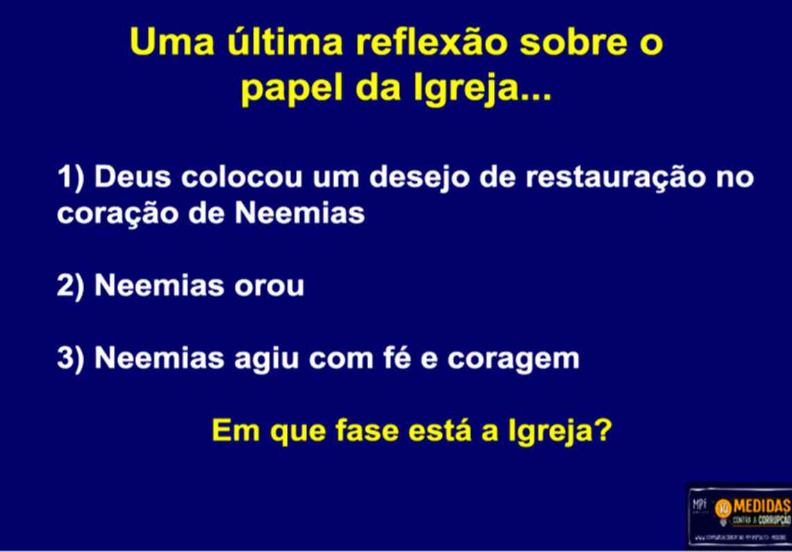 Dallagnol tinha um PowerPoint só para suas palestras aos evangélicos e, entre os slides, o de Neemias: o mesmo PowerPoint era usado nas apresentações do pastor Marcos Ferreira: “Deltan, além do pedido acima preciso que me envie seu PPT para palestra em igreja”, solicitou o pastor no Telegram.