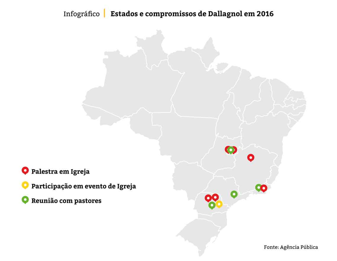 “O Deltan, ele tem sido mais do que um procurador-chefe da Lava Jato, membro do Ministério Público. Ele tem sido um servo do senhor. Ele tem usado a vocação que Deus deu para ele para trazer uma mudança em nosso país”, anunciou ao microfone o pastor Gil em uma terça-feira, 16 de agosto de 2016, reta final do processo de impeachment da presidente Dilma Rousseff. Dallagnol foi cumprir mais uma agenda da campanha das dez medidas de combate à corrupção, dessa vez na Igreja Batista da Lagoinha, em Belo Horizonte, a mesma da ministra da Mulher, da Família e dos Direitos Humanos, Damares Alves. Seu anfitrião foi André Valadão, que no ano passado anunciou voto ao então presidenciável Jair Bolsonaro (PSL).