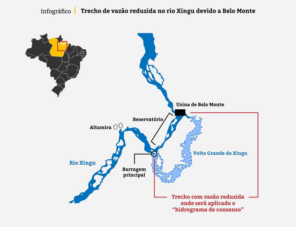 Para a usina funcionar, foi construída uma barragem principal no rio Xingu, que desviou a água necessária na geração de energia para dois reservatórios – com isso, criou-se um “trecho de vazão reduzida”. Nesse trecho, onde está localizada a Volta Grande, a quantidade de água que passa – a vazão – não é mais a natural do rio, mas a artificialmente liberada pela concessionária de Belo Monte, a Norte Energia S.A.