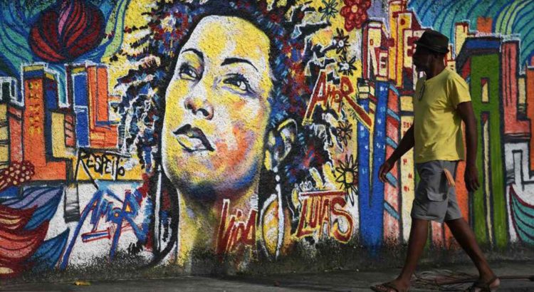 Foto: Homem caminha em frente a um mural de Marielle Franco, no Rio de Janeiro.