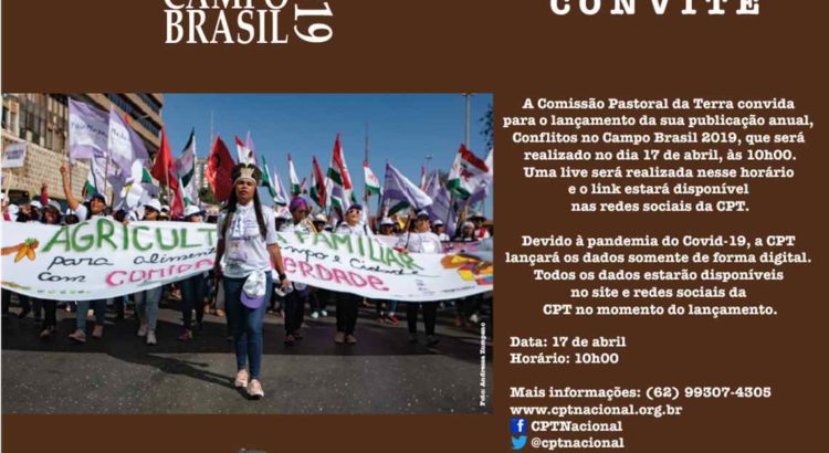 Devido à pandemia do Covid19, o lançamento será feito a partir das 10h00, de forma digital no site e redes sociais da CPT. No mesmo horário será realizada uma live com a participação do coordenador nacional da CPT, Paulo César Moreira, a professora da Universidade Federal de Goiás (UFG), Maria Cristina Vidotte e o jornalista e colaborador da CPT, Antônio Canuto.