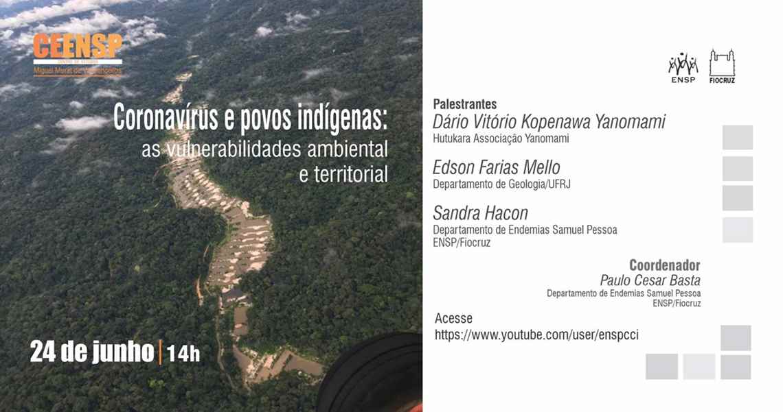 No próximo dia 24 de junho, às 14h, será realizada a 3ª edição do Centro de Estudos Miguel Murá de Vasconcellos da Escola Nacional de Saúde Pública (CEENSP), em seu novo formato digital. Na oportunidade, será debatido o tema Coronavírus e povos indígenas: vulnerabilidades ambiental e territorial na Amazônia.