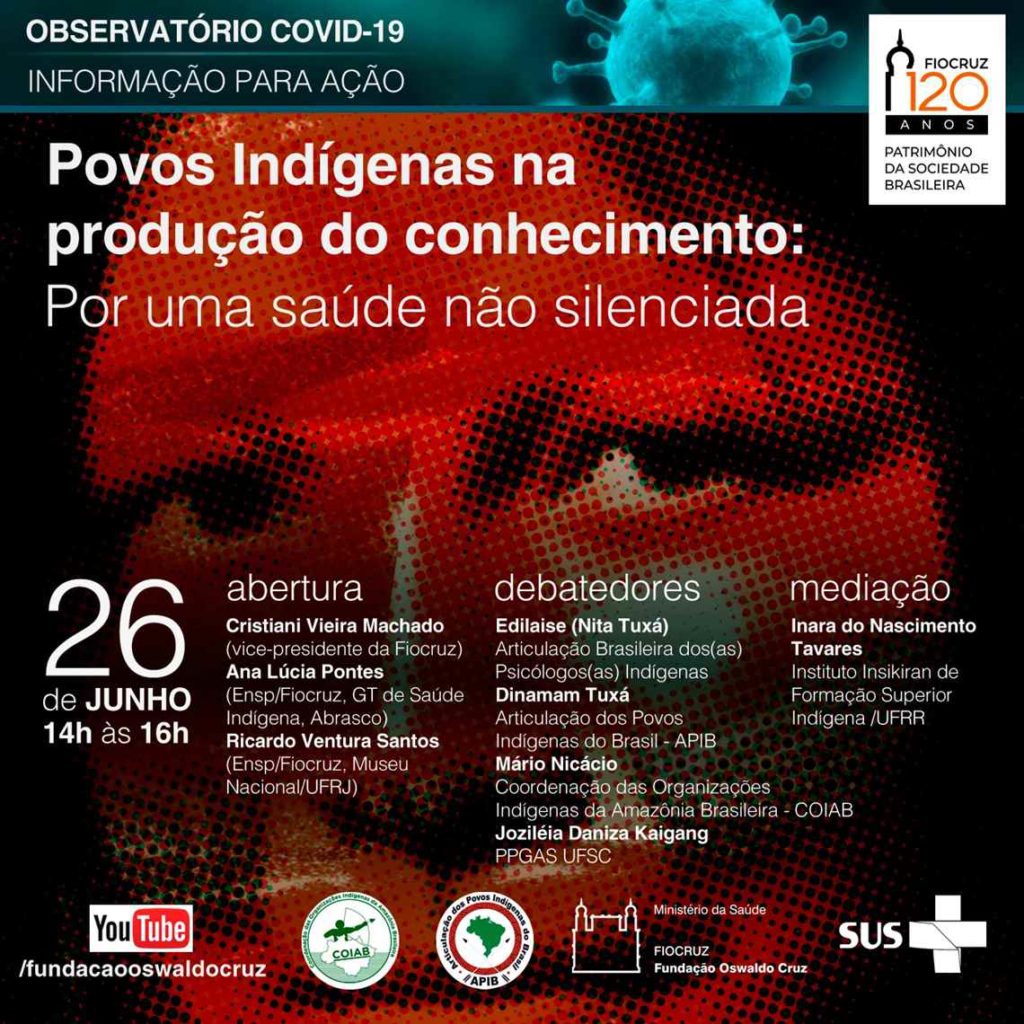 O Observatório Covid-19, da Fiocruz, vai promover nesta sexta-feira (26/6) o debate Povos indígenas na produção de conhecimento: por uma saúde não silenciada. O encontro virtual, que será transmitido pelo canal da Fundação no YouTube, das 14h às 16h, abordará as perspectivas e trajetórias indígenas no ensino superior e na pesquisa. Essa atividade faz parte do projeto Vozes Indígenas na Produção do Conhecimento e visa fortalecer o diálogo e a cooperação entre um grupo de pesquisadores do campo da saúde dos povos indígenas, ligado à Escola Nacional de Saúde Pública (Ensp/Fiocruz), e intelectuais indígenas. O projeto tem o apoio da Vice-Presidência de Ambiente, Atenção e Promoção da Saúde (VPAAPS/Fiocruz).