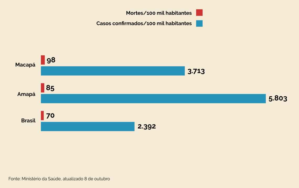 Com uma população de cerca de 845 mil pessoas, o Amapá registrava na última sexta-feira, 9 de outubro, 49.215 casos confirmados de Covid-19, a terceira maior incidência por 100 mil habitantes do país. Em Macapá, que concentra 60% da população do estado, eram 18.725 casos. Além disso, o estado no Norte do Brasil registrava 725 óbitos na sexta-feira, sendo 499 deles na capital.