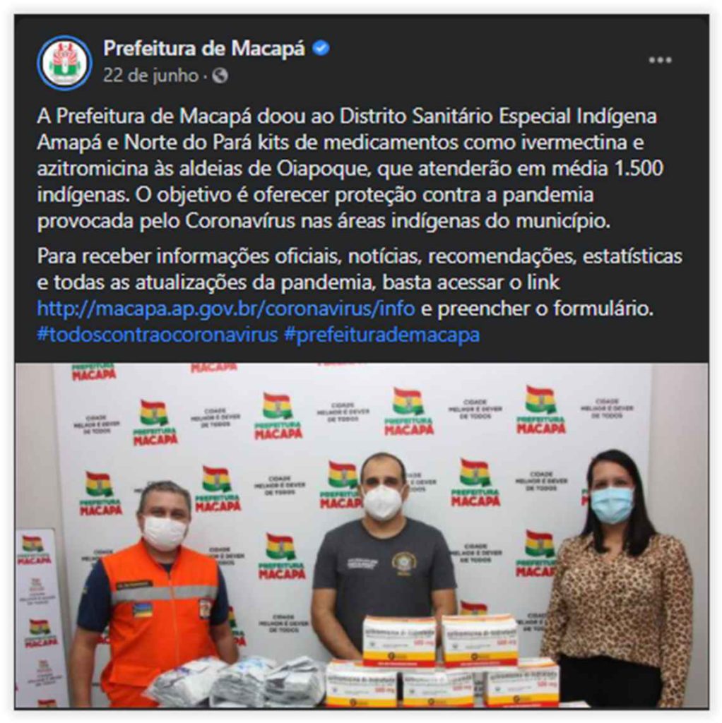 Prefeitura de Macapá chegou a doar kits com ivermectina e azitromicina para o Distrito Sanitário Especial Indígena (DSEI) da região – Reprodução/Facebook