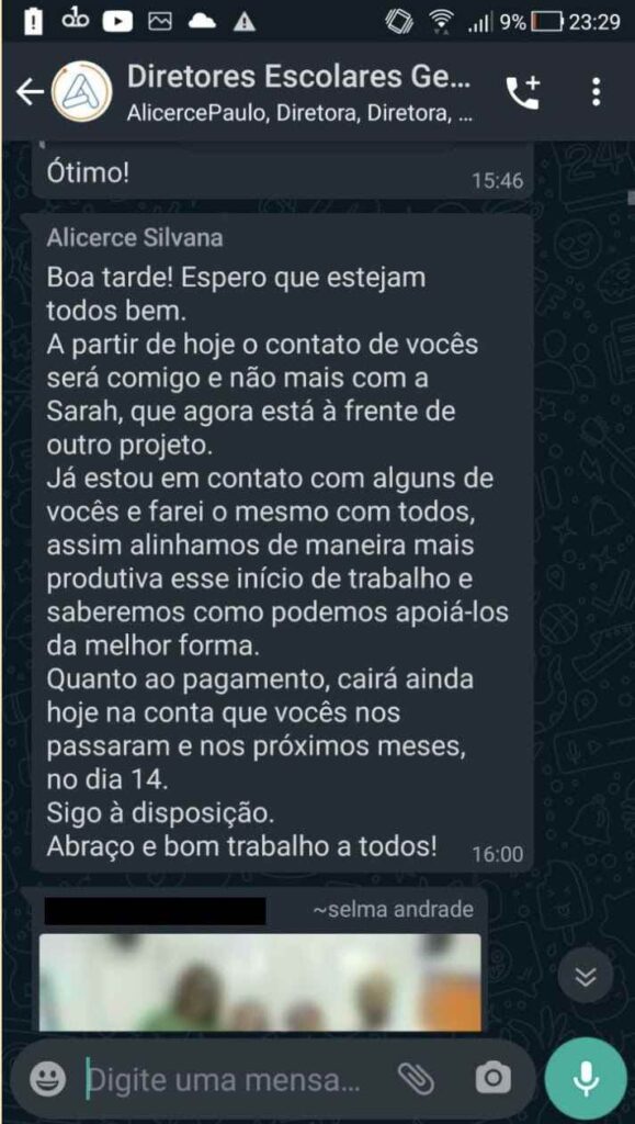 Na quarta-feira, 6 de janeiro, entrei em contato com Selma Andrade, diretora da escola Estadual Maria Leda Brigo, de Guarulhos, que estava no grupo de WhatsApp “Diretores”. Ela nega que tenha recebido pagamentos da empresa.