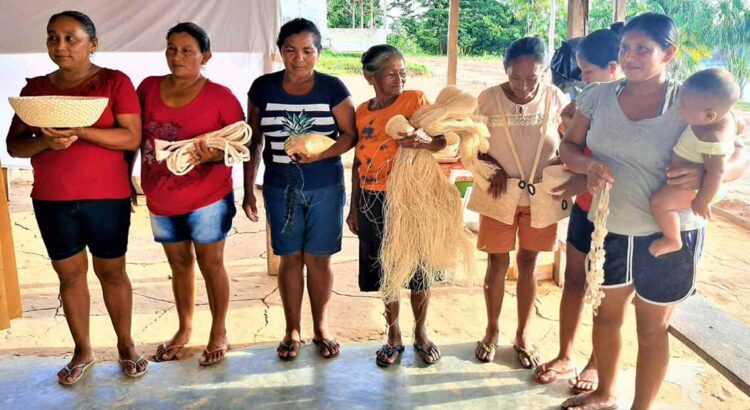Artesãs apresentando seus produtos feito com fibra de tucum
