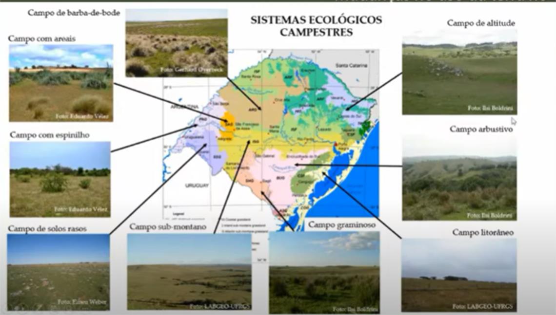 Esses campos são diferentes em relevo, na fisionomia – ou seja, nas espécies que são visíveis – e também são distintos em relação ao solo; há campos mais pedregosos, áreas de solo mais profundo, áreas de solo mais arenoso, campos arbustivos etc. A ideia que eu gostaria de passar é que não existe apenas um pampa, um campo, que cobre e é homogêneo em todo o RS, mas diferentes campos que formam o bioma pampa e os campos do bioma mata-atlântica.